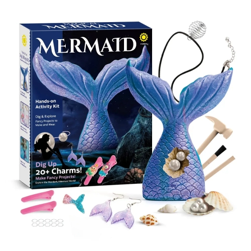 Детски археологически комплект Морски свят–русалка е въображаем и образователен комплект за разкопки, който позволява на децата да открият и сглобят реплика на скелет или артефакти, свързани с митичните русалки. Тази практическа играчка съчетава фантазия с учене, предлагайки увлекателно изследване на легендите и фолклора за русалките. Стимулира креативността и любопитството към митичните създания, като същевременно осигурява забавно и интерактивно археологическо изживяване.