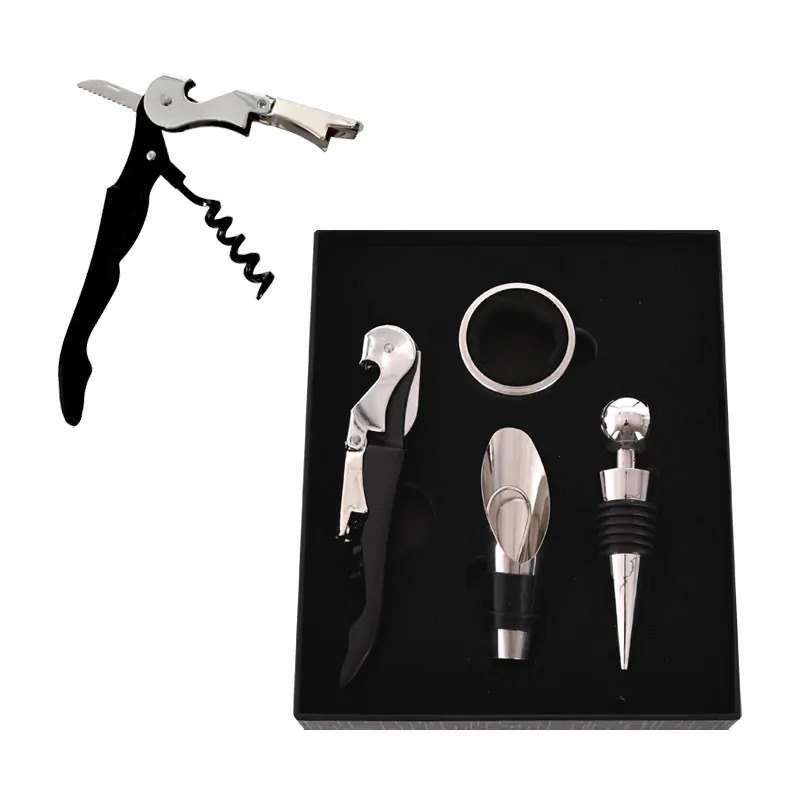 – тирбушон 3 в 1 /функционален тирбушон за изваждане на коркови тапи, комбиниран с ножче за фолио с назъбено острие и отварачка за метални капачки/