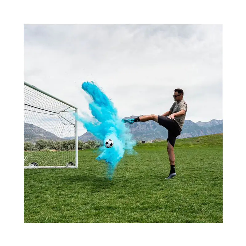 При удар с крак, топката ще излети и ще се разтвори, ракривайки цветен прах съответстващ пола на детето.